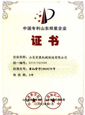 中國專利山東明星企業證書